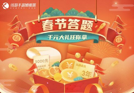 从2月6日开始至2月16日之间,在迅游手游加速器参与“春节答题”活动即可赢取答题积分。每日大奖开启时间为2月6日-10日以及2月13日-16日,在此期间参与答题冲榜的日榜第一名玩家可以获得200元的任意游戏充值卡以及迅游VIP年卡;在2月11日-2月12日期间冲刺除夕大奖的日榜第一名玩家可以获得1200元的任意游戏充值卡和迅游VIP年卡;2月16日的终极大奖冲榜玩家可以获得终极好礼,包含了3000元的任意游戏充值卡以及3张迅游VIP年卡等超值好礼,具体的游戏大礼各位玩家可以前往迅游手游加速器参与了解。