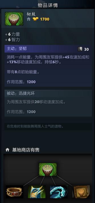 韧鼓的配方可谓是每个版本都会被改动,最早用圣殿指环、护腕合成,后来改为王冠+艺人面罩+风灵之纹+卷轴,在现在版本中,更新为了力量腰带(450)+法师斗篷(450)+风灵之纹(250)+卷轴(550),韧鼓的主动使用的次数也从5次增加到了8次。