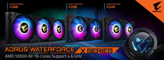 2021年02月24日,继上一代广受好评的AORUS LIQUID COOLER后,技嘉科技推出新一代AORUS WATERFORCE X SERIES一体式水冷散热器,新款水冷针对玩家不同的需求提供包括240、280及360等三种尺寸,皆可支持采用Intel及AMD现有及下一代插槽的多核心高阶处理器。除了高支持度及配置弹性之外,AORUS WATERFORCE X SERIES在功能及设计上也大幅提升,其中水管管径加大2.1mm以增加37%水流量,搭配採用陶瓷轴心帮浦设计,除了提升耐用度,解热效果也大幅提升。同時水冷排风扇导入石墨烯油轴承,奈米石墨烯油具有极度润滑及低摩擦系数等特性,可有效減少轴承摩擦及碳沉积,不但延长使用寿命,更避免一般滚珠轴承在低转速会产生的摩擦噪音,让系统运作更安靜。此外,广受玩家推崇的LCD显示上盖设计更是进一步提供多样內建模式及创新的客制化设定,不但增加了Chibi Time- AORUS小雕养成模式,更提供对MP4影片、GIF动画及JPG图档支持,而透过內建Micro SD卡插槽的支持,玩家可以根据需求扩充容量來储存要显示的素材,随时更换改变造型与心情,搭配RGB FUSION的多种灯光模式支持,让散热器不再只是散热器,进一步颠覆你对水冷散热器的想象。