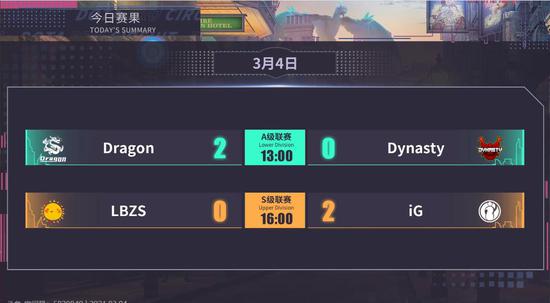 DPC中国联赛3月4日赛况,A级联赛在Dragon与Dynasty之间展开了较量,首局比赛中Dragon在全面崩盘的情况下以拼命四保一战术顽强翻盘,并且于第二局轻松击败对手以2:0赢得胜利。S级联赛LBZS与iG的对抗中,iG教科书般的三号位炼金术士在前期发育后完美哺育队友,最后决胜团中又跳羊先手配合强秒对方变体精灵,帮助队伍先下一城,第二局比赛中iG以碾压之势轻松击溃LBZS,锁定DPC中国联赛前三的位置。