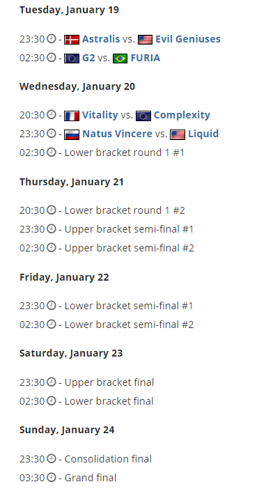 在1月19日的揭幕战中,世界排名第一的Astralis将面对Evil Geniuses,随后是精彩的G2对阵FURIA的比赛。