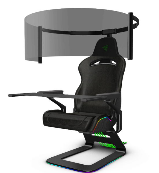 座椅下方的底座部分引入了类似Razer Raptor战鹰显示器的线缆管理系统。与座椅顶部相连接的则是一块60英寸环绕式OLED全景显示屏,它将呈现震撼的游戏视觉体验。而在闲置时,该显示屏可以折叠收至椅背后方。