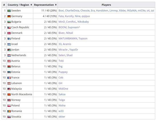 欧洲区选手的国家分部就非常分散,唯一占比较多的是瑞典选手。虽然瑞典DOTA2近些年难言强势,但他们依然有zai这样的顶尖选手,Alliance、Liquid、Chicken Fighters三队也主要由瑞典人组成。