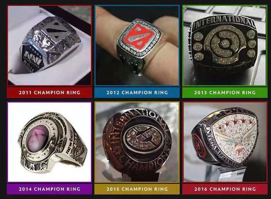 每年的TI冠军都会获得一枚冠军戒指作为纪念。往年的冠军戒指如下图所示: