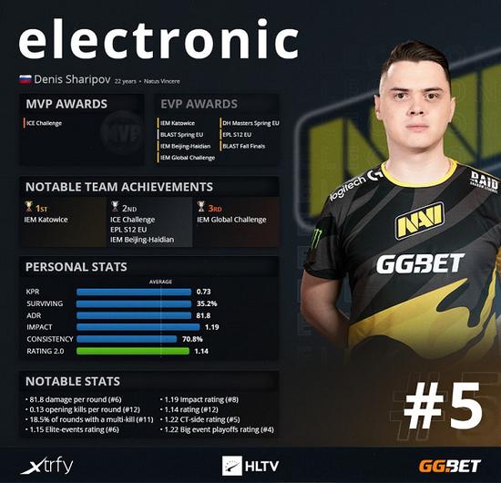 Denis "electronic" Sharipov凭借在今年最重要的赛事中的精彩表现和重大赛事中的稳定发挥获得了今年TOP 20评选中的第五位。