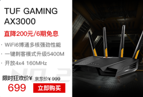 TUF GAMING AX3000电竞特工路由,粗旷棱角造型,军工级用料的采用博通WiFi6多核处理器,提供了强劲性能,支持一键刺客模式轻松升级5400M,支持WiFi6制式开放的4X4 160MHz,提供高速率无延迟电竞网络平台。同时内置UU游戏加速器,主机、PC、手机游戏全能加速,你能体验到网速如飞的感觉。年货节限时狂欢价699元,支持6期免息。