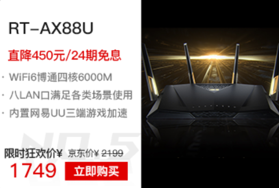 华硕RT-AX88U电竞路由是业内首款WiFi6路由标杆,整合OFDMA与MU-MIMO技术,可利用4X4 160MHz带宽及1024-QAM调制编码优势,具备高速并发处理机制,带机量高达256台。RT-AX88U电竞路由采用博通1.8GHz 四核芯片,搭载1GB内存、256MB闪存,双频并发传输速率高达6000Mbps,有效提升数据传输处理能力与网络性能。RT-AX88U电竞路由内置Game Boost和WTFast双重游戏加速引擎,对于游戏玩家而言,将带来更稳定、更低延迟的数据传输,绝对是游戏好伴侣。年货节限时狂欢价只需1749元,支持24期免息。