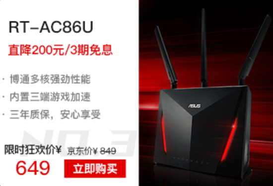 华硕RT-AC86U它采用红黑搭配,外观上的立体感很强。机身底部与四周遍布散热栅孔,立式机身散热效能显著。性能方面,RT-AC86U游戏路由采用博通1.8GHz高速处理器,内置硬件级游戏加速引擎。它还具备AiMesh2.0智能组网技术,可轻松搞定各种大户型WiFi6覆盖,实现大户型无缝漫游。年货节限时狂欢价只需649元,支持3期免息。