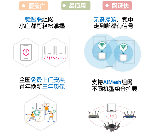 华硕灵耀魔方MESH路由身材虽小,但可以实现广域覆盖。得益于灵耀魔方量身打造的高增益调校天线,采用45°倾斜天线多角度布局,信号覆盖面积广,两只覆盖300平米丝毫无压力。大house小别墅都能轻松拿下。一键智联功能,小白都能轻易操作。灵耀魔法采用博通四核WiFi6芯片,内置硬件级引擎加速,DMIPS高达16500+,四倍多设备连接能力,支持OFDMA、MU-MIMO,可稳定连接200多台设备,可谓小身材大能量。灵耀魔方还支持全国免费上门安装服务,尊享上手可用体验。三年质保,服务无忧。年货节狂欢价只需849元,支持6期免息。