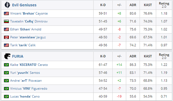 BLAST全球总决赛败者组首轮比赛中,EG在先输一图Inferno的情况下,而后两图稳住阵脚,最终以二比一的比分成功翻盘FURIA。FURIA也成为了本次BLAST全球总决赛首支淘汰出局的队伍。