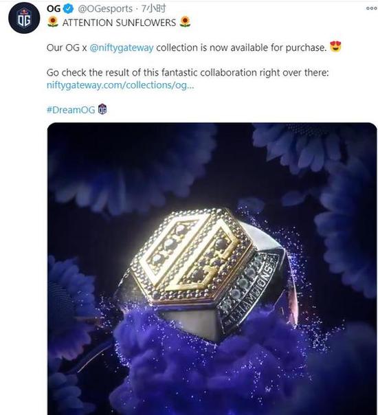 近日,OG战队在官推上宣布和虚拟纪念品平台Nifty Gateway达成合作,在该平台上推出了一系列虚拟版本的TI冠军戒指供粉丝们购买。