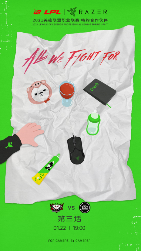北京时间1月22号,备受玩家关注的2021LPL春季赛EDG与JDG的战斗已经正式落下帷幕了。在此次EDG与JDG的大战前夕,LPL联赛新赞助商雷蛇在赛前发布了一张海报,图中一只有小树苗标记的小手正伸向一堆物品。小树苗是JDG mystic的儿子,这些物品都是EDG和JDG的代表物,黑人牙膏、公爵Zoom的红酒杯、猪头标志、Viper(雷蛇Viper鼠标)、教练笔记、奶瓶。
