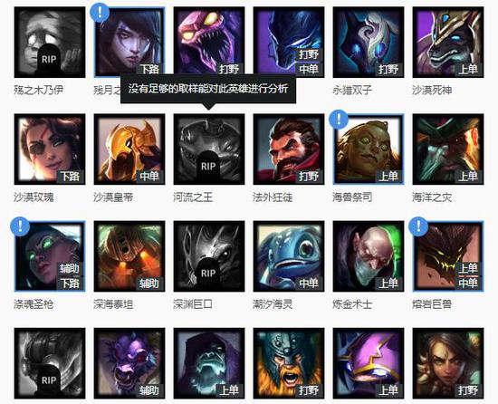 有人欢喜便有人愁,有些英雄的选用率甚至低于1%,你可能打100把排位赛,都未必能够遇到一次。在数据统计网站OP.GG上,如果一个英雄的选用率低于0.5%左右,那么,他们就会被标记为灰色头像RIP状态,意味着“没有足够的取样能对此英雄进行分析”。