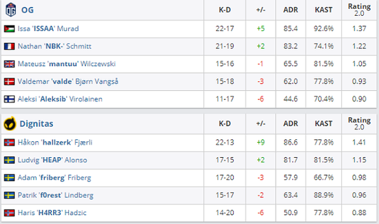 决胜图来到Dust2,Dignitas先CT开局。OG在上半场依旧显得有些慢热,在第二回合翻盘的情况下,也仅仅在半场攻下6分。而在换边之后,OG虽然赢下了手枪局,但还是很快遭到Dignitas强起翻盘,在mantuu起出AWP后,OG的防守明显有所好转,而ISSAA和valde这两个重要火力点也发挥了起来,最终帮助队伍在加时赢下比赛,比分19-16。