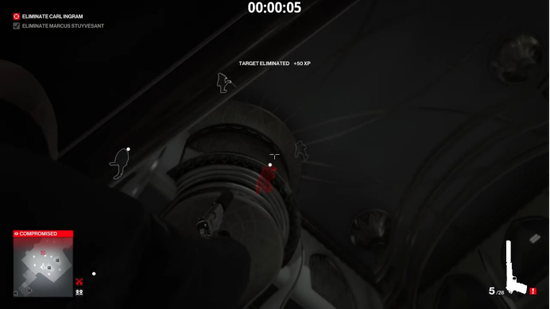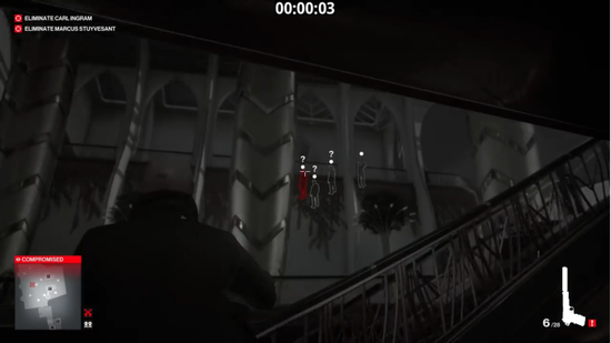 接着向上方开枪吸引保安的注意,快速杀掉Marcus Stuyvesant,转身即可杀掉在另一边的Carl Ingram即可通关。