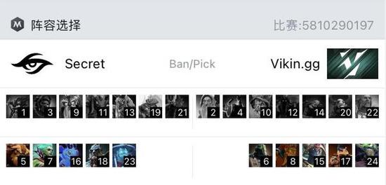 第一局比赛,Secret这边拿出了撼地者、死亡先知、帕克、幻影长矛手和风暴之灵,似乎Vikin.gg则是拿出了大地之灵、蝙蝠骑士、神谕者、巨魔战将和孽主。