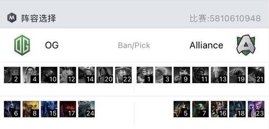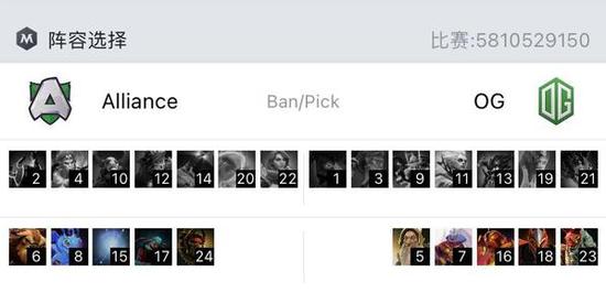 第二局比赛,OG这边拿出了拉比克、酒仙、力丸、暗影恶魔和小小,而Alliance这边则是选出了司夜刺客、先知、伐木机、幻影刺客和虚无之灵。