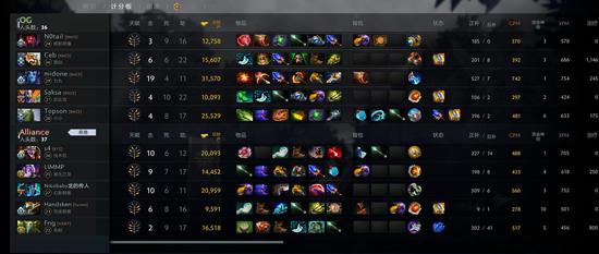 对线期结束,Alliance领先了OG将近1k的经济,幻影刺客虽然在中期多次阵亡,但好在拥有黯灭的他刷钱速度依旧很快,紧随力丸之后。