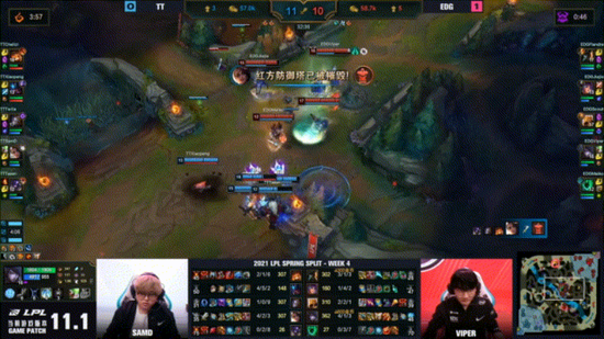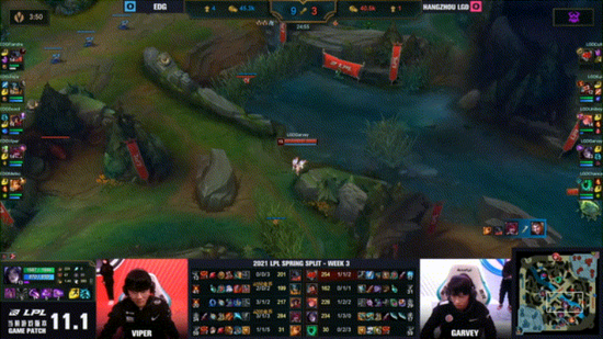 EDG战队之所以能够取得五连胜的佳绩,Viper功不可没。这位征战多年的老将有着极其恐怖的发育能力,即使在对线期惨遭针对,他同样能够在中期补充发育后期接管比赛。Viper选手的高光时刻十分之多,比如在S9世界冠军Tian的手中二度抢下远古龙击败FPX;在团战中打出爆炸伤害击溃对手;还有就是Viper的比赛专注度了,在与LGD首局战斗中,Viper先是在野区隔墙击杀杰斯,随后又是在打红buff之际看到卡莎的到来,此时的Viper果断闪现调整倒钩的位置控住卡莎成功完成单杀。