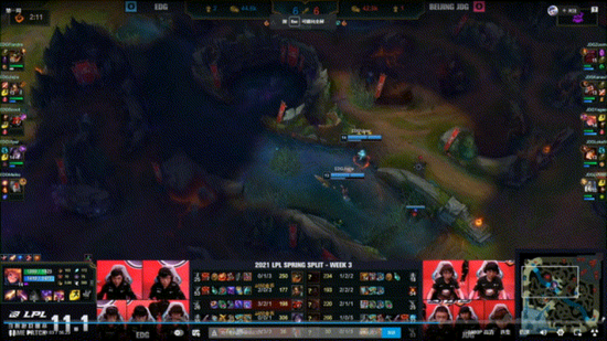 同样是与JDG的天王山大战,同样是经济落后的EDG。在首局比赛的中期,随着Scout的阵容,圣枪哥与Meiko状态不佳,JDG战队趁势开打大龙,此时Jiejie站了出来,闪现进入龙坑一个稳健的惩戒成功在野王Kanavi手中抢到了大龙。正是凭借着Jiejie的这一抢大龙操作,才让EDG有了后期翻盘的机会。