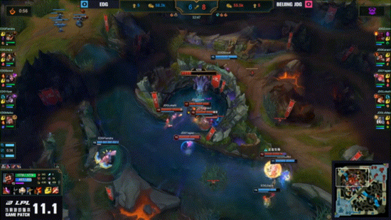 在EDG与JDG战队的天王山大战中,圣枪哥两局史前巨鳄彻底掌控团战。在首局的对决,占据优势的JDG战队在后期强开大龙,此时圣枪哥一个在泉水中TP到场一马当先直冲JDG人群彻底将战局分割,随后在面对JDG四人的集火下打出伤害和控制并且还存活下来,EDG趁势一波翻盘。