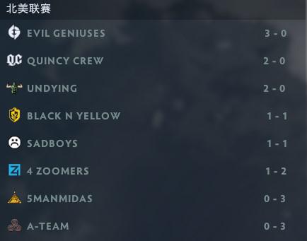 北美联赛的局面为EG一家独大,在召入了iceiceice之后,在北美联赛展现出了他们应有的统治力,目前3-0位于积分榜榜首。虽然SumaiL-暂时离开了北美,但他的哥哥YawaR仍然在为NA DOTA发光发热,其所在的QC战队以2-0的战绩位居积分榜次席,其余的战队中,我们可以看到一些熟悉的老面孔,如Fear、ppd、Dubu等,由于北美联赛只有两个直通Major的名额,因此这些战队们的目光可能都盯在了QC战队积分榜第二的位置。在四支非直邀战队中,只有Undying成绩尚可,5ManMidas(五个点金手?)和A-Team目前都难求一胜,0-3的战绩处于降级边缘。