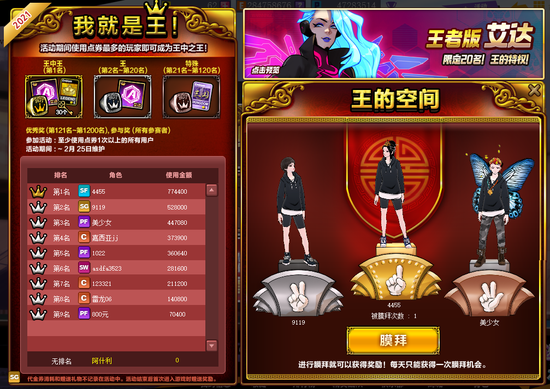 凡是挑战主播成功的队伍每人即可获得粉色星辰(弹跳+3,30天) 、闪亮发型(盖帽+3,粉色,30天)以及毛皮披肩(三分球,白色,30天)作为奖励。主播小A将在直播过程中抽取一位幸运玩家送出艾达新角色一个。