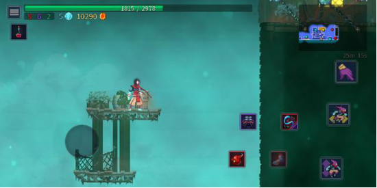《重生细胞》在操作上进行了优化,左边摇杆控制角色方向,右边按钮控制技能,加在一起超过10个按键,每个按键的具体功能需要玩家在游戏过程中熟悉。