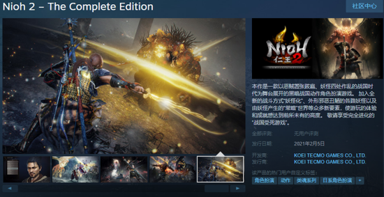 《仁王2》Steam版2021年2月5日解锁发售,售价249元。作为PS4平台的爆款游戏,游戏性堪比《只狼》。本作是一款以恶贼嚣张跋扈、妖怪四处作乱的战国时代为舞台展开的黑暗战国动作角色扮演游戏。,加入全新的战斗方式“妖怪化”、外形邪恶丑陋的各路妖怪以及由妖怪产生的“常暗”世界等众多新要素,使游玩的体验和成就感达到前所未有的高度。