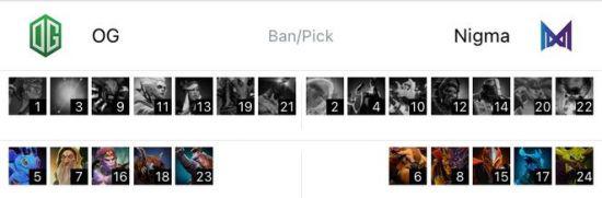 OG天辉,选择剑圣帕克黑贤三核,辅助是发条和谜团。Nigma夜魇,选择敌法龙骑小牛三核,辅助是凤凰和DP。