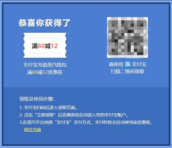 之后在蒸汽平台充值钱包余额时,支付方式选择-支付宝,在付款时会自动使用优惠券。