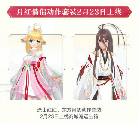 另外,更有全新涂山红红/东方月初动作套装定于 2 月 23 日正式发布。疯狂为月红打call,美好姻缘从现在开始。