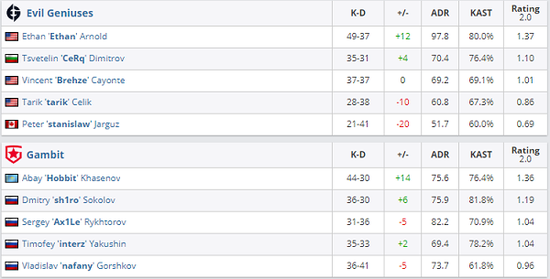 首张地图来到Gambit选择的Overpass,Evil Geniuses先CT开局。EG在赢得手枪局的情况下于前期获得比分领先,但Gambit的选手们手感火热,nafany和Hobbit都在进攻方打出了2.00+的rating,帮助队伍在半场结束时拿到了8分。换边之后,双方上演翻盘大战,最终EG更胜一筹,依靠Brehze的枪法连连得分,以16-13的比分拿下胜利。