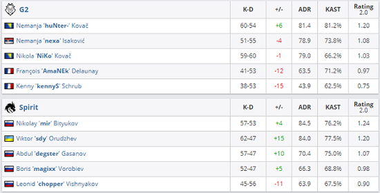 首张地图来到Spirit选择的Train,G2先CT开局。Spirit在赢下手枪局后遭到了G2的强起翻盘,huNter-和NiKo两兄弟在防守方如鱼得水,帮助队伍连拿5分打出一波小高潮。随后,degster的大狙开始发力,配合magixx凶猛的正面火力,Spirit逐渐占据上风。在换边之后,独联体队伍率先拿到赛点,G2连追四分,最终以14-16的比分输掉图一。