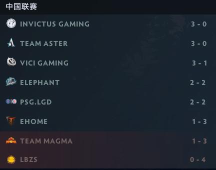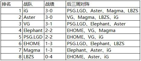 而积分榜中游的3、4名席位争夺也同样激烈,休赛期前的最后一场Elephant在击败PSG.LGD之后,两队以2-2战绩同分处于第4和第5。虽然VG目前以3-1位列第3,但在后面还将分别对阵上述两队,作为第3、4席位直接竞争者,VG战队现在依然不能有丝毫松懈。