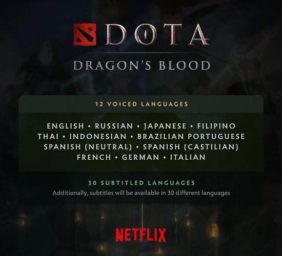 同时Netflix和DOTA2官方都宣布了本作的译音及字幕,官方将提供12种语言的配音以及30种语言的字幕。其中配音包括以下语言: