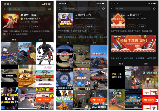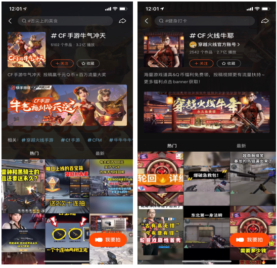 除了欣赏大神的游戏直播外,快手还采取了符合平台特色的运营模式,一方面放出游戏道具、Q币、流量券、苹果手机等福利奖品,一方面鼓励用户将自己的游戏作品发布到平台上获取曝光推荐,短短几天内,“CF手游牛气冲天”“绝地牛人秀”“CODM牛起来”等相关话题下的作品数量飞速上升,点击量达到上亿级别。