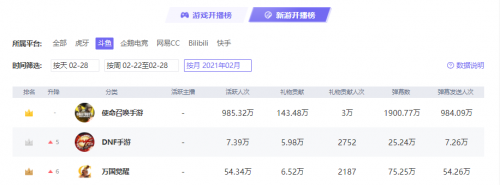 而根据小葫芦统计的数据,《使命召唤》手游自12月公测以来,始终处于斗鱼平台的新游开播榜榜首,2月份活跃人次达到了985万,弹幕数量更是超过了1900万条。
