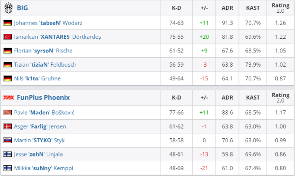 图一是FPX选择的Inferno,BIG先做防守。FPX 4-0开局,五人今日都不算差的枪法是FPX稳定得分的关键,BIG本图更多的是“各凭本事”,于FPX相比BIG的团队配合似乎做得更少,所幸XANTARES和tabseN两人状态在线帮助BIG下半场反超比分,然而由于BIG拿到赛点后迟迟无法结束图一,反被FPX抓住机会用几次精彩的残局在加时赛中19-17反杀BIG。