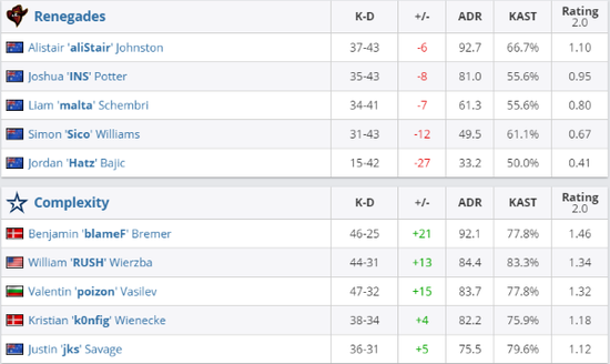 Renegade与Complexity实力差距明显,图一Infenro上,Renegades仅有aliStair一人取得1.0以上的rating,火力严重不足的他们难以突破coL的防守,虽然在下半场拿下手枪局的Renegades追回8分,但是巨大的比分差距还是使coL 16-11拿下图一。图二Mirage上更擅长防守的Renegades 6-0开局大优,不仅补枪迅速,几次精彩的残局也帮助他们上半场领先3分,来到进攻方,Renegades拿下手枪局后又再次深陷进攻困境,战术打不起来,提速又对不过枪,Renegades根本找不到突破口。coL没有放过追分机会,blameF和poizon两人以1.7以上的rating帮助队伍下半场反追10分,最终图三16-11击败Renegades。