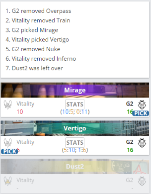 G2 2-0 Vitality(Mirage 16-10;Vertigo 16-6;Dust2)