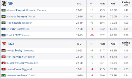 首图是NiP选择的Overpass,先做T方的NiP赢下手枪局,次局karrigan和rain双人五杀翻盘。上半场节奏不快,双方都打得很稳,控图慢摸,架点等前期准备必不可少,直至半场结束NiP领先三分。换边后进攻方FaZe将比分追至9平,次局ztr和Plopski长管出烟双杀打乱FaZe进攻节奏,随后NiP再次领先。然而FaZe在11-14时手枪提B完成翻盘,比分再次被扳平。转折点出现在14平后,FaZe的提速被NiP两度刷屏,图一最终以NiP 16-14获胜。