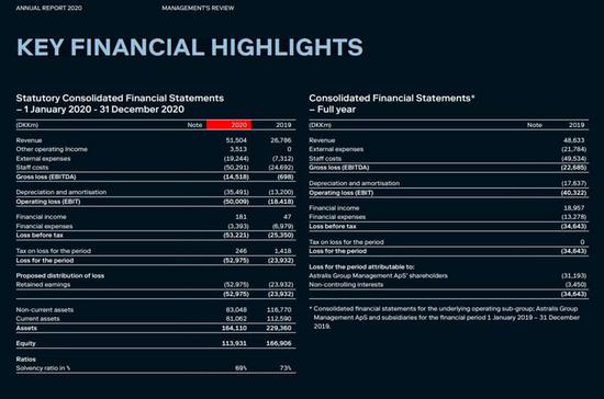 这份财报覆盖了Astralis Group 2020年整年集团的经营状况,根据财报显示,2020财年Astralis Group实现营收为515万丹麦克朗,对比2019年的267万增长了近一倍,但是由于内部的开支以及人员支出的增加,整个集团依旧处于亏损状态。2020年累计亏损达530万丹麦克朗,2019年的这个数字是346万。