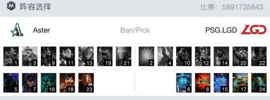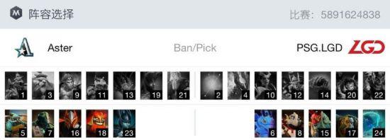 Aster在天辉,LGD在夜魇,阵容选择上,Aster前两手选出飞机土猫,LGD选择了帕克发条,三四手Aster拿出龙骑玛尔斯,LGD选择了墨客狼人,最后一手Aster选出PA,LGD选出水人。