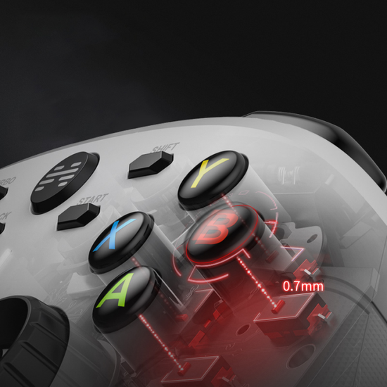 北通阿修罗3游戏手柄搭载电竞级机械按钮,独立的微动开关如同机械键盘般具有清脆利落的按键段落感,游玩时按键反馈非常饱满给力。仅0.7mm的触发行程极速响应输入指令,于传统导电胶按键缩短35%触发时间,帮助玩家输入音符更加快速准确,相比于键盘由于键程长、响应慢等出现的跳拍等问题,使用北通阿修罗3游戏手柄输入的音符明显更容易击中节奏。