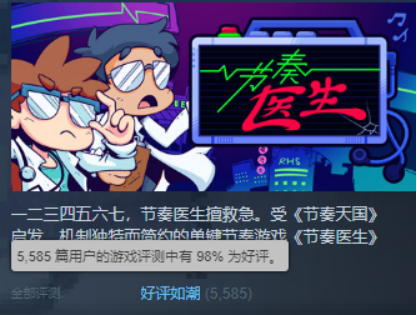 受《节奏天国》启发,由7th Beat Games打造的独立音游《节奏医生》已在2月26日在Steam开启抢先体验阶段。这是只需要一个操控按键、“有手就行”的节奏游戏,却引起了巨大的反响与赞美:截至目前5585篇用户评测中,《节奏医生》收获了98%的好评率,可谓是好评如潮。