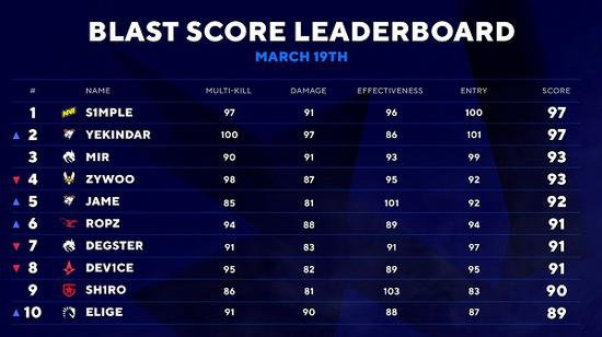 BLAST于昨日更新了选手战力排行榜,该榜单从多杀、伤害、影响力和首杀等方面评估了选手在面对TOP30队伍时的表现,最终以数字的方式较为直观的体现出来。