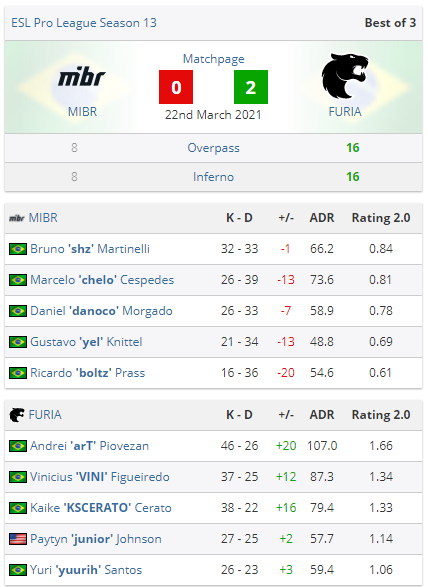 FURIA 2-0 MIBR(Overpass 16-8;Inferno 16-8)