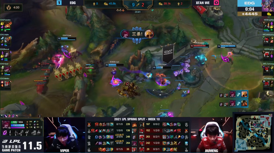 正如微笑所言,在WE与EDG的一战中,WE战队真的全场惨遭碾压。无论是在前期的比赛节奏还是在中后期的团战上,WE都远远不如EDG战队。尤其是在第二局的最后时刻惨遭Viper天秀收割,当时Viper单人故意与队伍脱节进入F6草丛,卡莎见状一个大招上前输出却反遭倒钩控制反杀,虽然泰坦与沙皇趁势上前输出,却还是被Viper击杀。这一波打完,WE就连仅存的士气都输掉了。