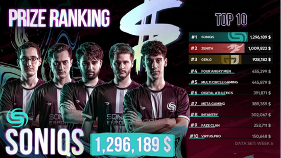 本次PGI.S最终大奖获得者,是来自北美赛区的强队Soniqs。在为期六周的比赛中,SQ共有四周成功晋级周决赛,虽然在本周开赛之前,他们仅仅位于排行榜第15名。SQ战队有着欧美队伍都较为擅长的刚枪能力,在赛事运营方面,他们过去的表现却似乎总是棋差一招。而谁也没有预料到,这支在前五周“韬光养晦”的队伍会在第六周的赛场上大放异彩。